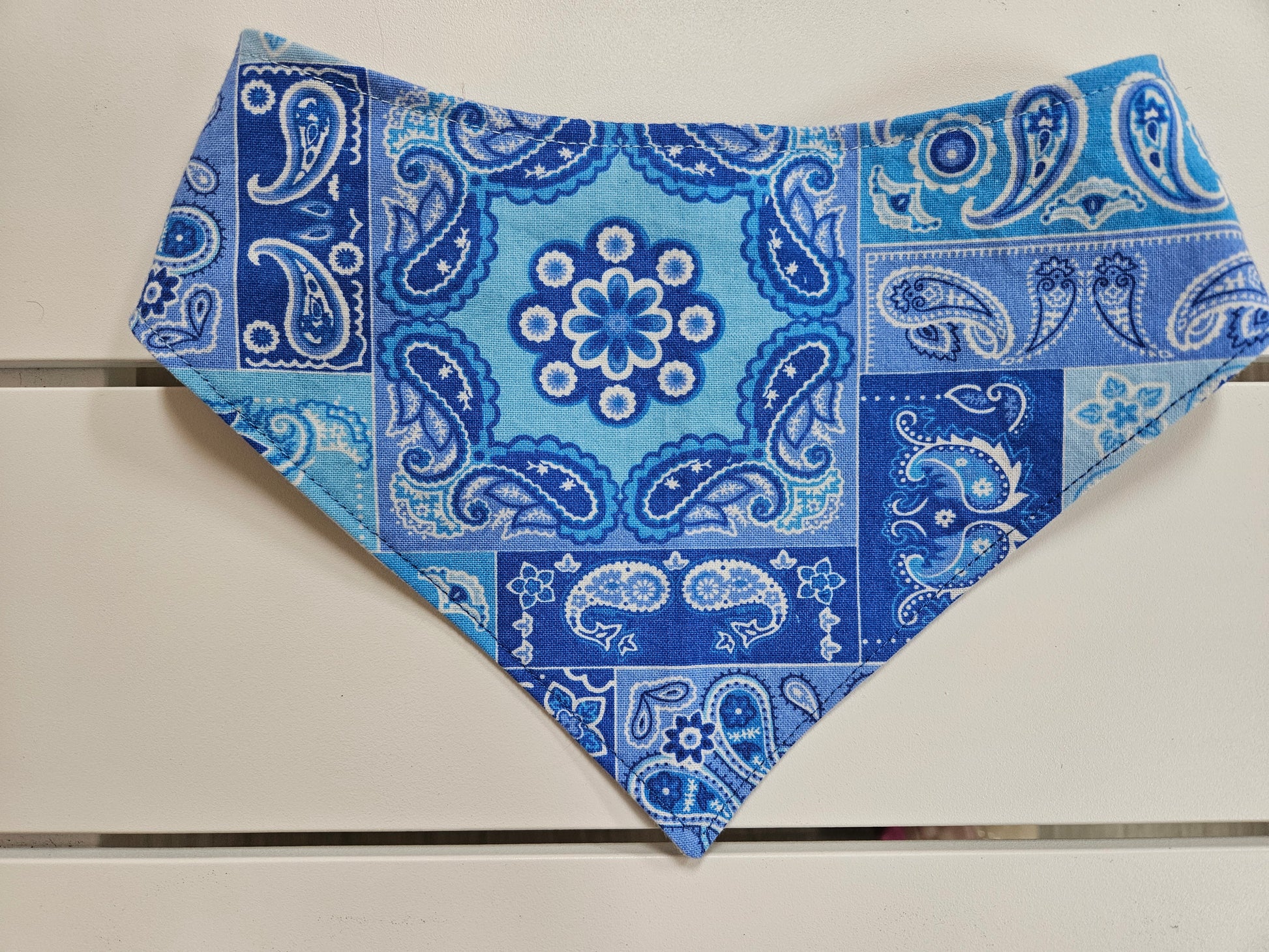 Whether it's a daily walk, a special photoshoot, or a lazy Sunday at home, this handmade bandana offers both style and comfort. Each piece is carefully crafted in small batches for quality you can trust. Add the Blue Paisley with Plaid Snap-On Dog Bandana to your cart today and let your pup showcase timeless charm with a twist!