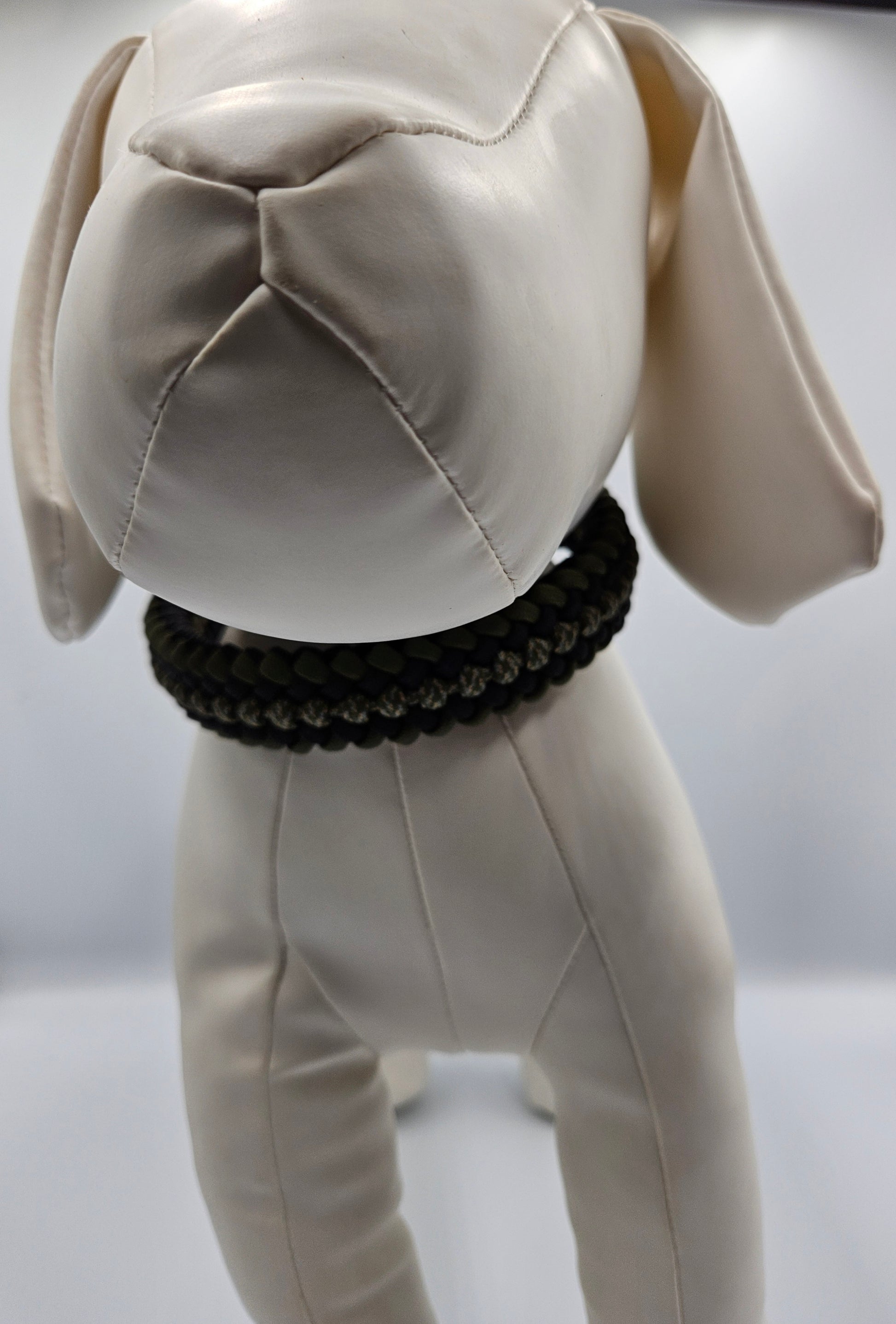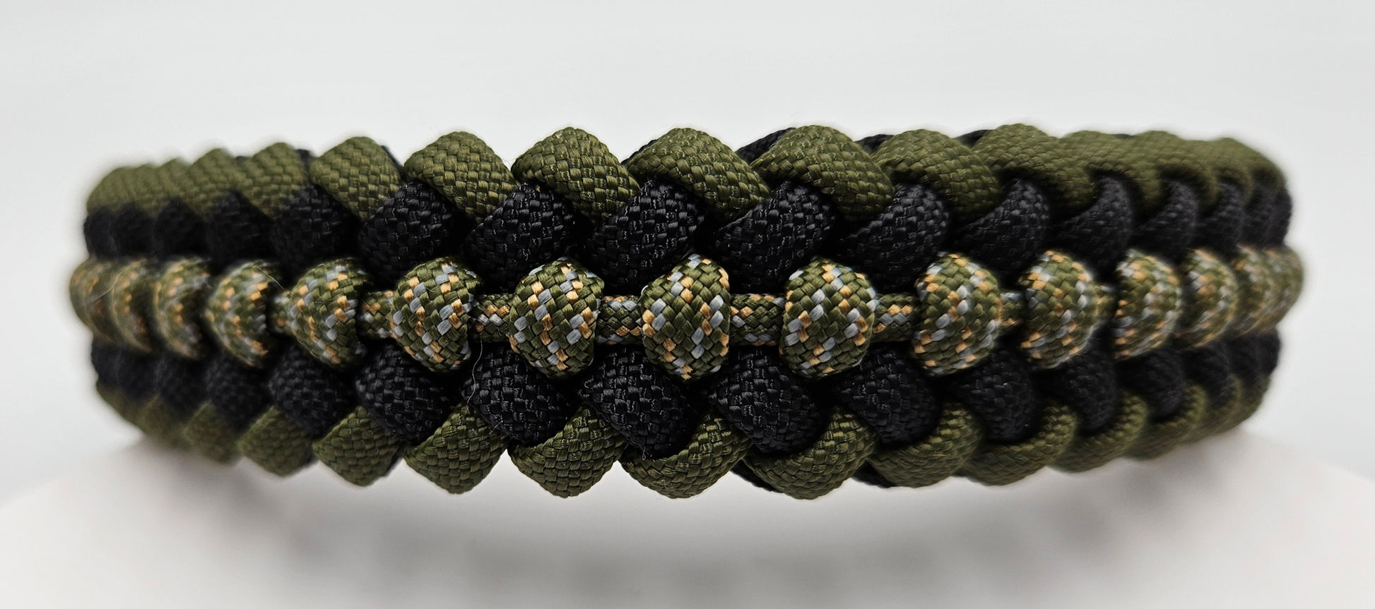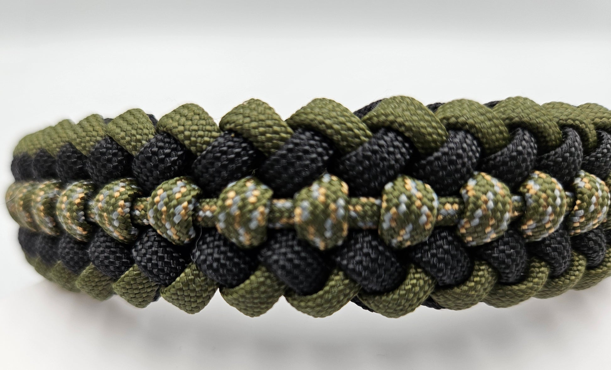 Each collar is handwoven with precision, ensuring a comfortable fit and lasting durability. The digital woodland camo accent cord runs through the center, framed by deep black and earthy olive green edges, creating a striking, military-inspired aesthetic.