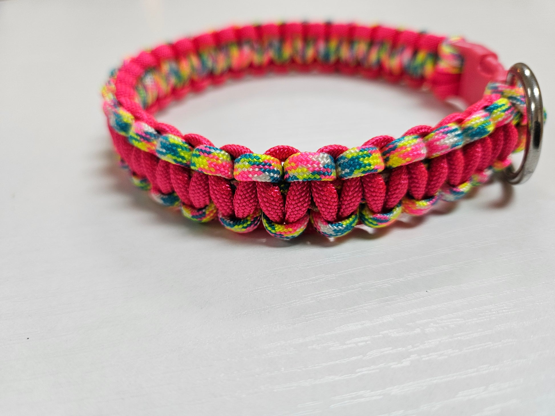 Neon Pink & Neon Rainbow Cobra Weave Paracord Dog Collar - 11 inch Limited Edition (fits up to 10 inch)